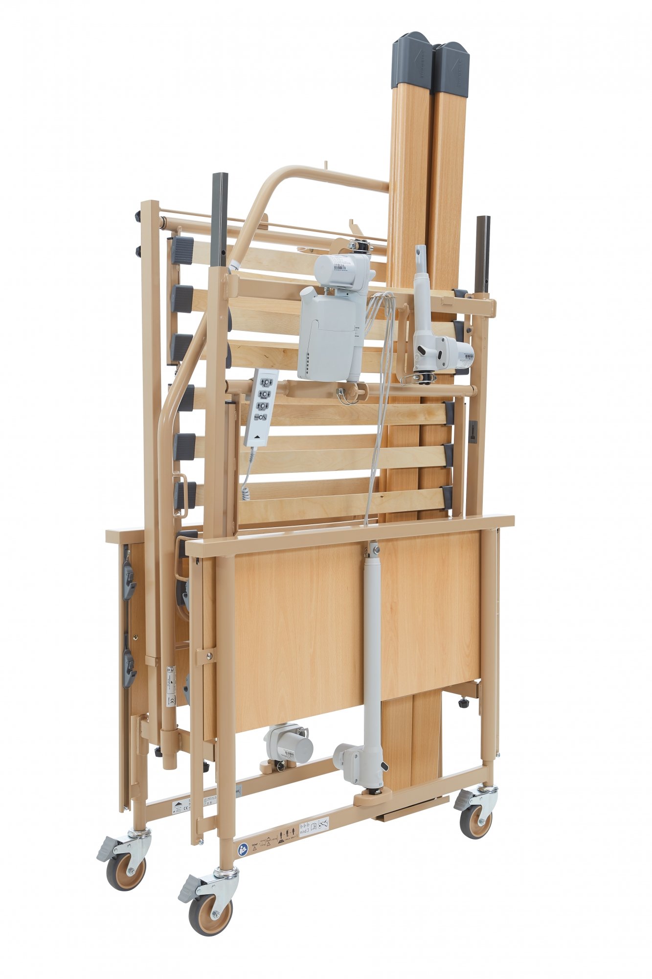 Maksimali lovos apkrova – 185 kg. Gulimasis paviršius – medinis, sudarytas iš keturių dalių, su laikikliais čiužiniui. Lovos galai pagaminti iš laminuotos medžių drožlių plokštės. Visos medinės dalys – buko spalvos. Atnaujintus 10 cm skersmens lovos ratukus su individualiais stabdžiais, laiduojančiais stabilią fiksaciją, galima naudoti avint šlepetėmis arba be jų. Galvūgalyje yra specialios kišenės pasikėlimo rankenai įstatyti. Lova komplektuojama su nuleidžiamais mediniais šoniniais turėklais iš abiejų lovos pusių ir pasikėlimo rankena. „Easy click“ sistema – užtikrintas apsauginių turėklų pakėlimas per kelias sekundes!