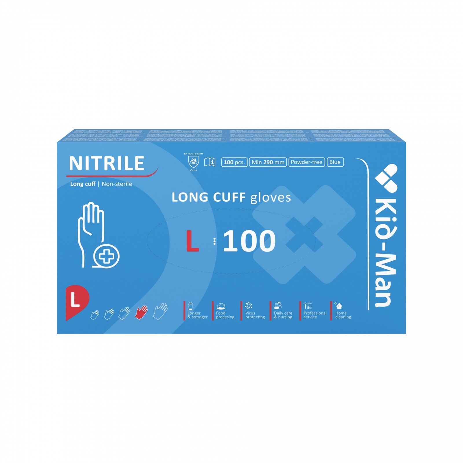 Nesterilios, elastingos, lanksčios ir atsparios nitrilo tyrimo pirštinės su tekstūruotu paviršiumi ir geru jautrumu. Aukštas apsaugos nuo daugelio cheminių ir infekcinių veiksnių lygis. Suderinamas su hidroalkoholiniais tirpalais ir geliais. Nitrilo medicininės pirštinės atitinka dviejų naujų reglamentų – medicinos prietaisų (2017/745 ES) ir asmeninių apsaugos priemonių (2016/425 ES) – specifikacijas. Šios aukšto lygio AAP apsauginės pirštinės priskiriamos CAT III kategorijai. Nitrilo pirštinės yra 4 dydžių: S, M, L, XL. Pirštinės ilgis 290 mm.