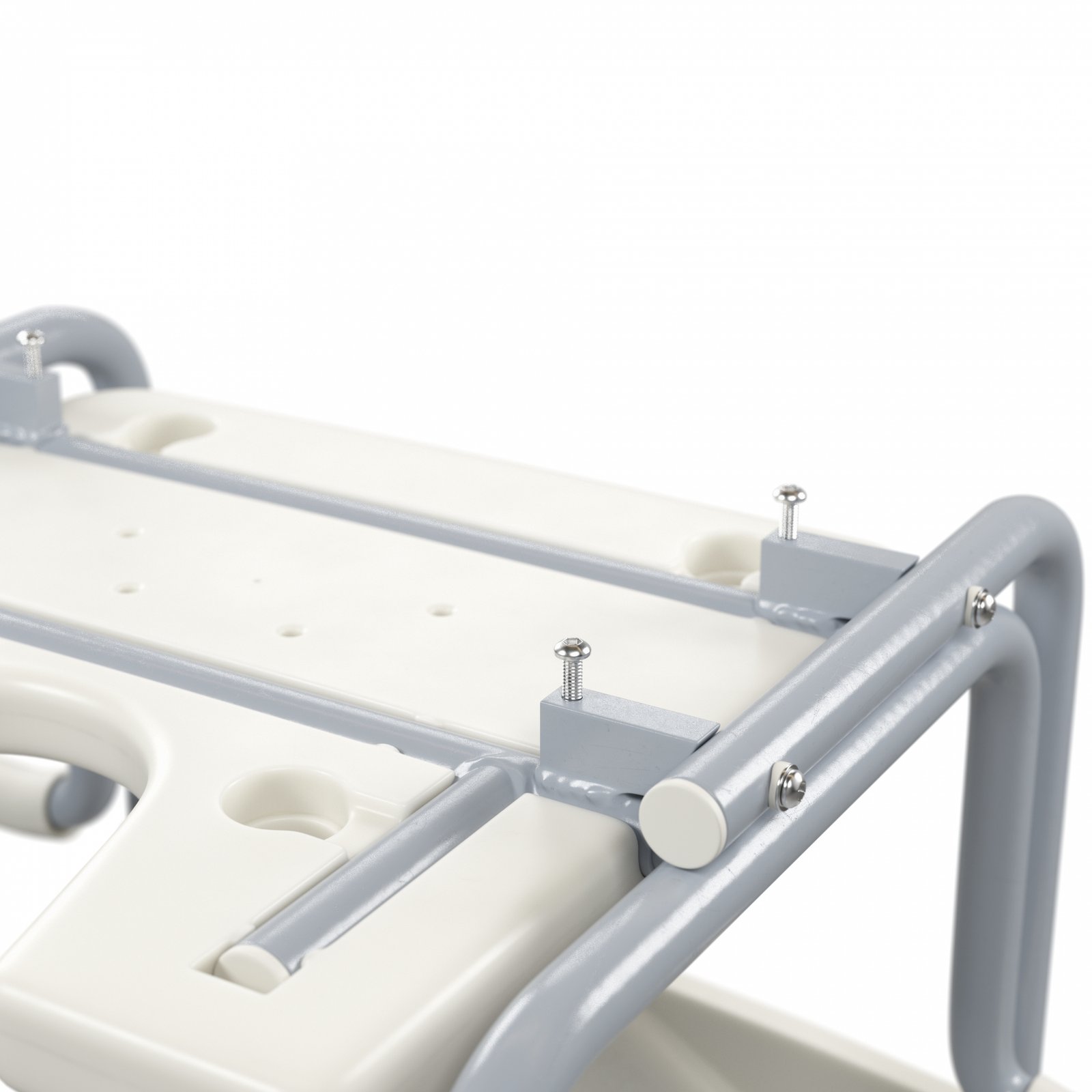 Surinkimas. Uždėkite sėdėjimo plokštumą ant rėmo. Lengvu paspaudimu užfiksuokite sėdimąją dalį rėme, įsitikinkite, kad sėdimoji dalis tvirtai laikosi. Reguliuodami kėdutės plotį atlaisvinkite apatinėje kėdutės pusėje esančius varžtus ir patraukite (sustumkite) kėdutės rėmo rankenėles tolygiai į kairę ir dešinę. Užfiksuokite atlaisvintus varžtus.
