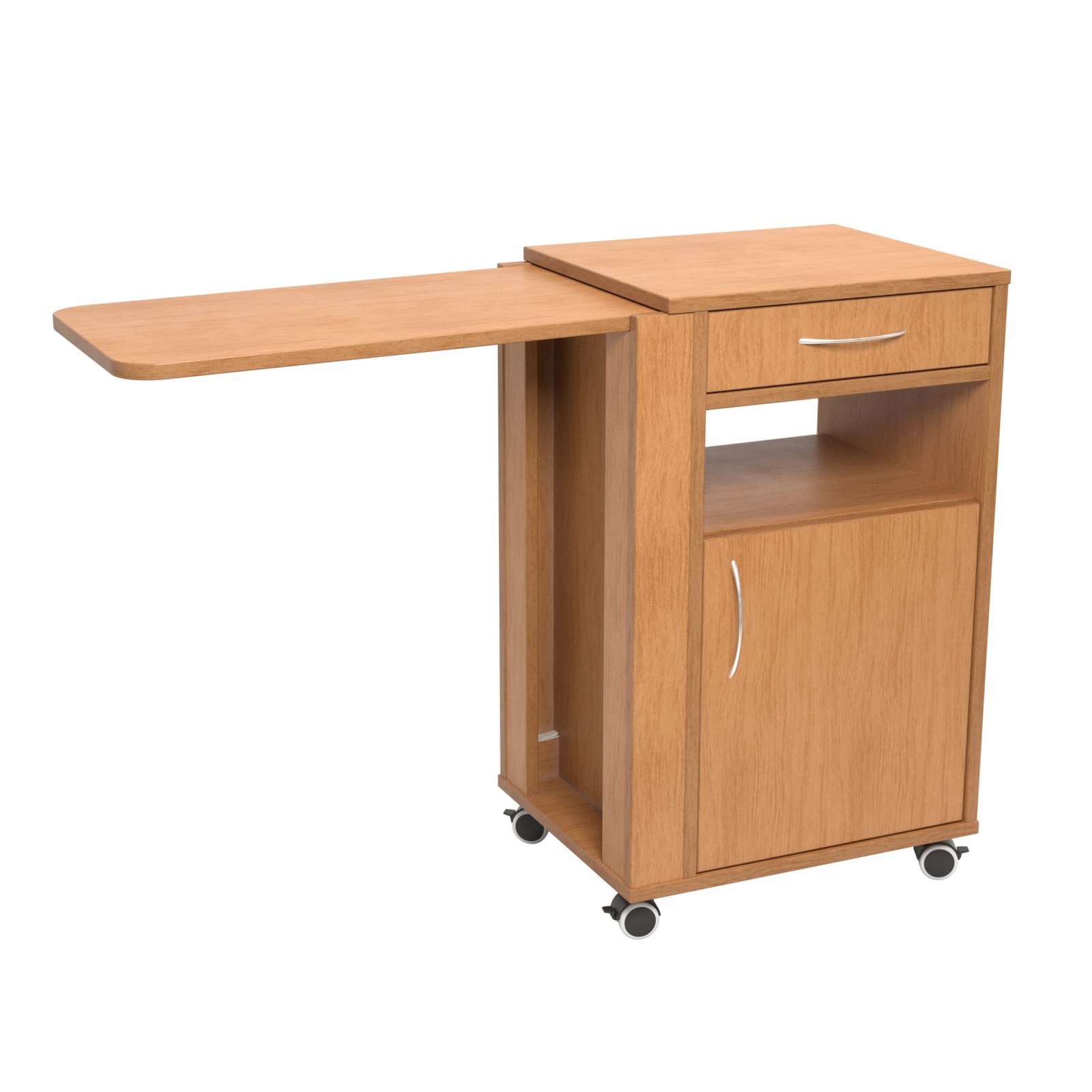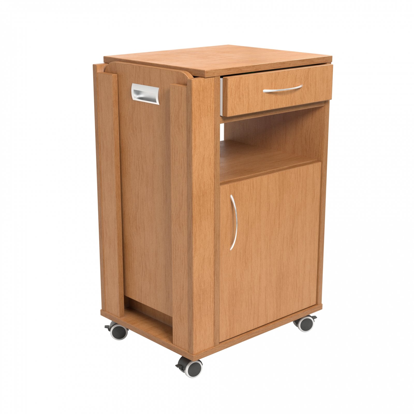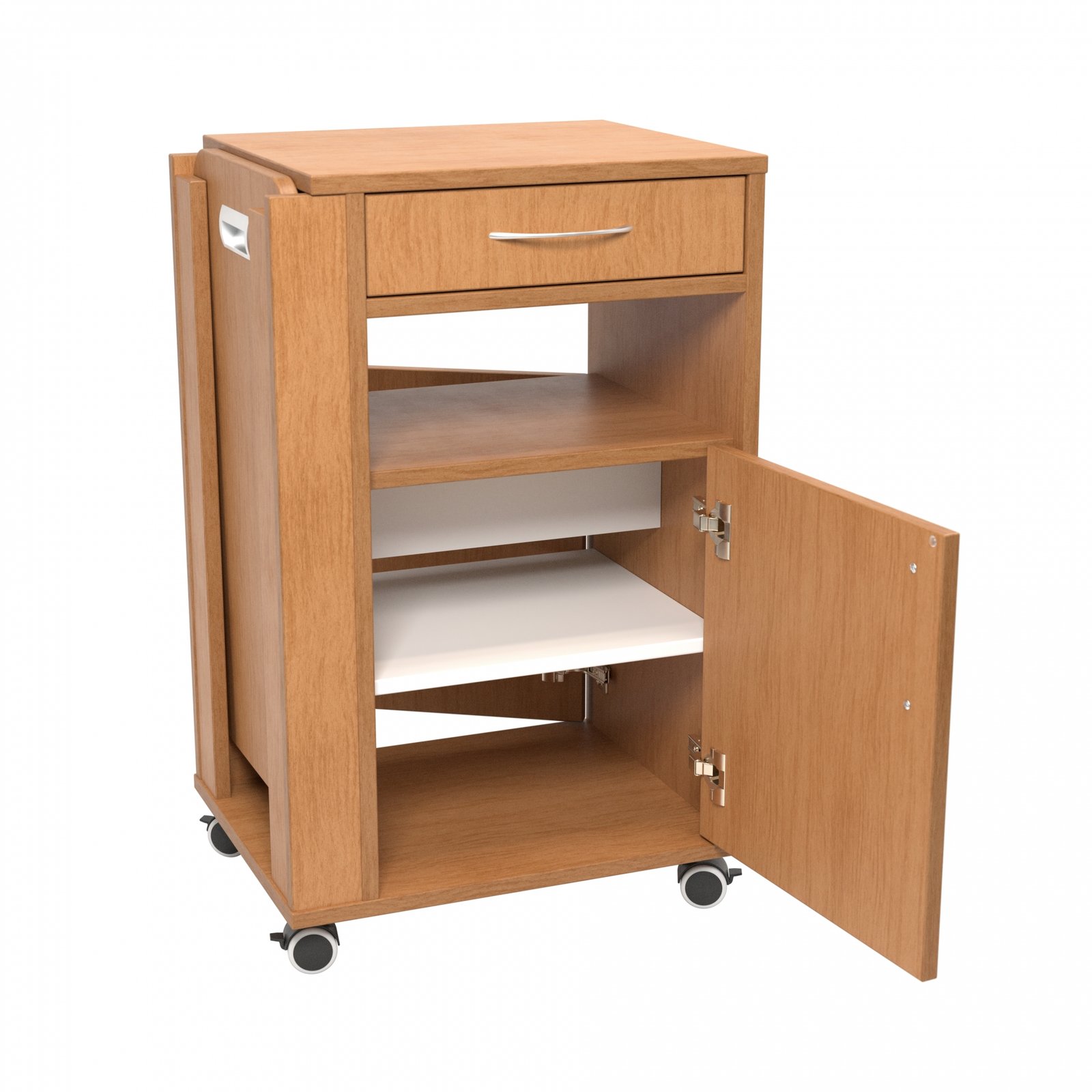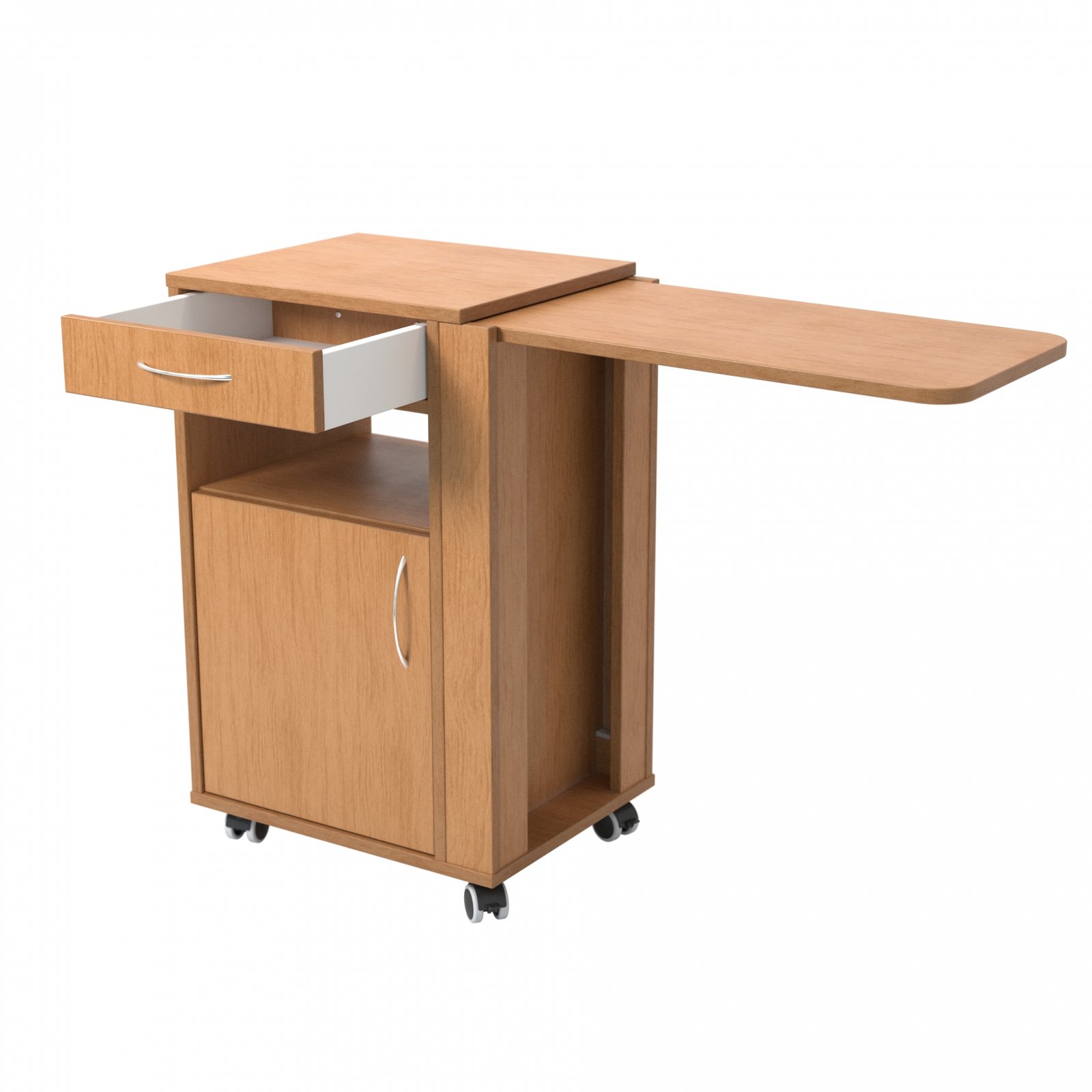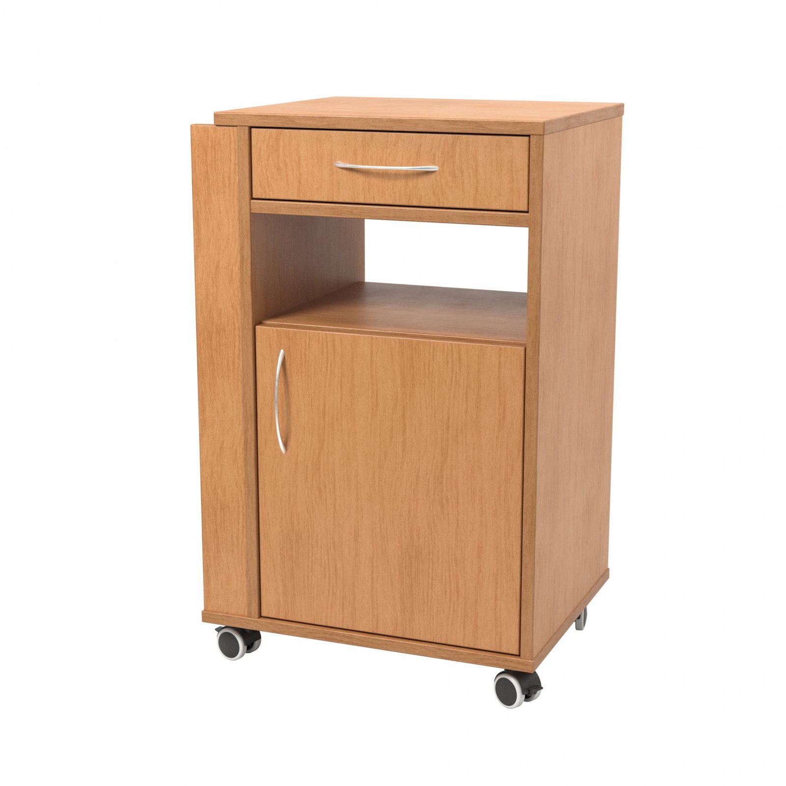 Spintelė su dvejomis durelėmis, viena lentyna, vienu ištraukiamu stalčiu ir atvira niša.