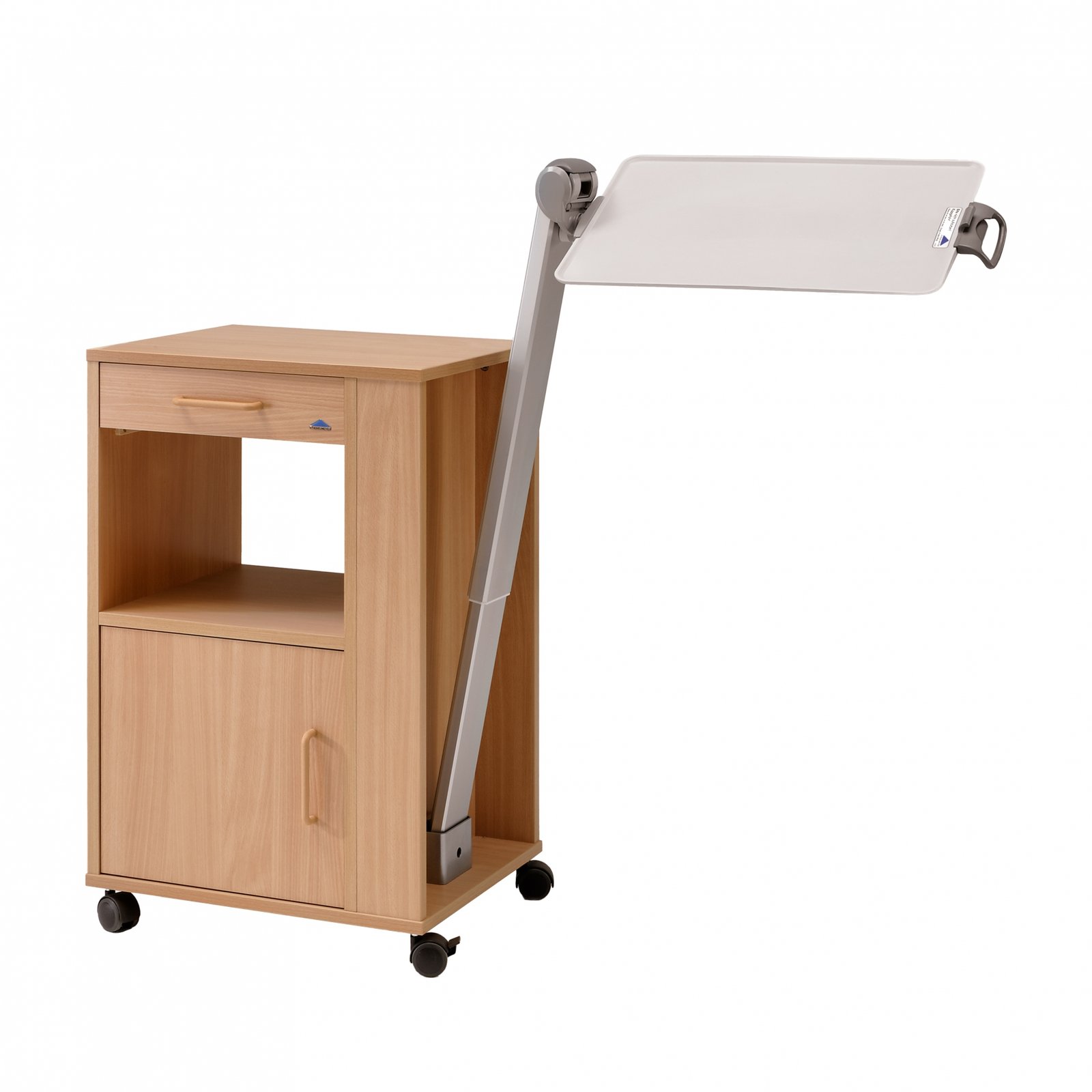 Spintelė pagaminta iš 1,9 cm laminuotos, plastiku padengtos medžio drožlių plokštės. Paviršius yra atsparus valymui ir dezinfekcijai. Šoninėje spintelės dalyje yra atlenkiamas, ant aliumininio, paslankaus stovo pritvirtintas,  reguliuojamo aukščio ir posvirio kampo, pakankamai erdvus staliukas su paukštintomis briaunomis, kuriuo galima naudotis valgant arba skaitant. Spintelė turi 4 dvigubus 5 cm gumuotus, grindų netepančius, tyliai riedančius ratukus (2 iš jų –  su stabdžiais), todėl  ji yra labai manevringa ir saugi.